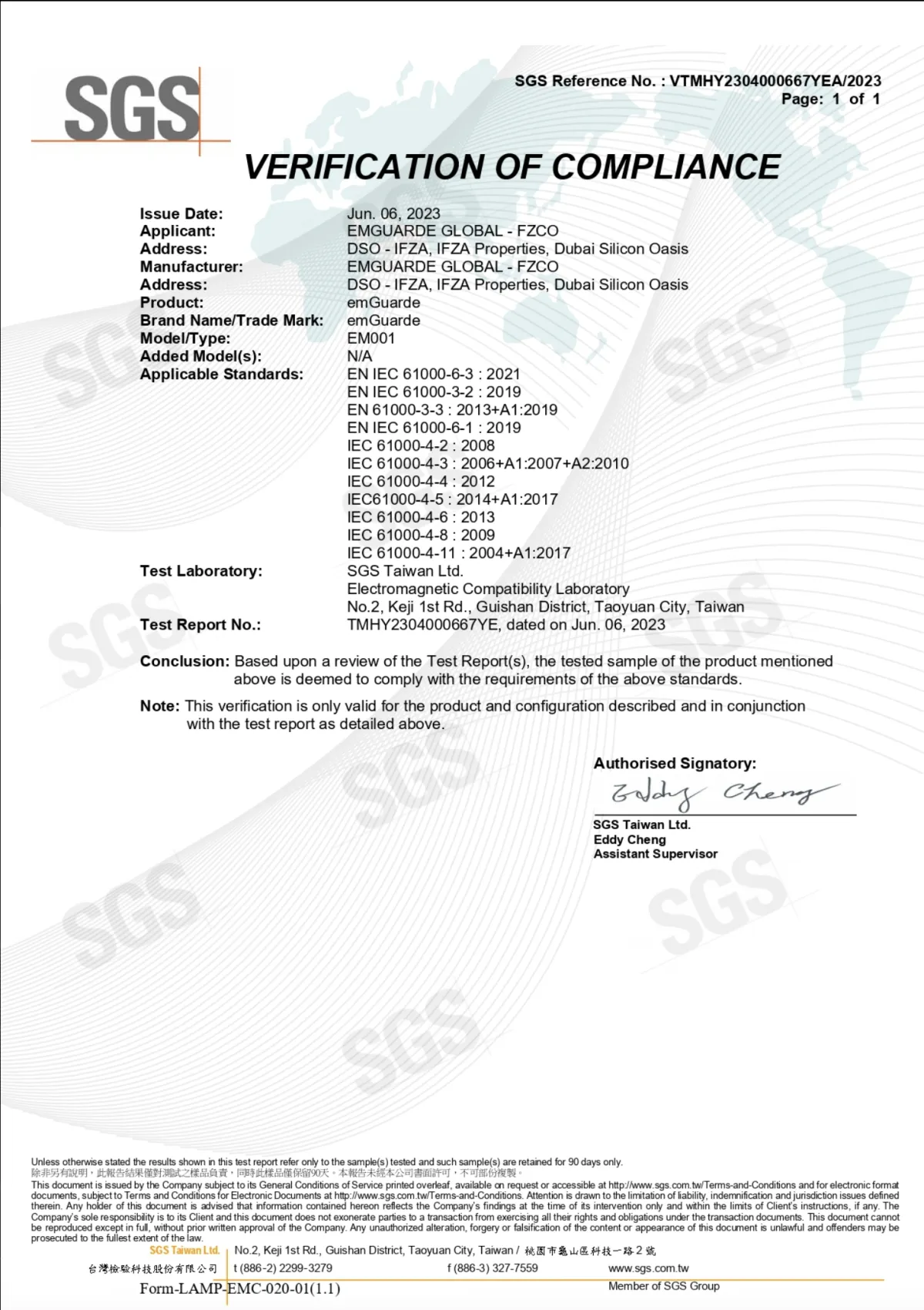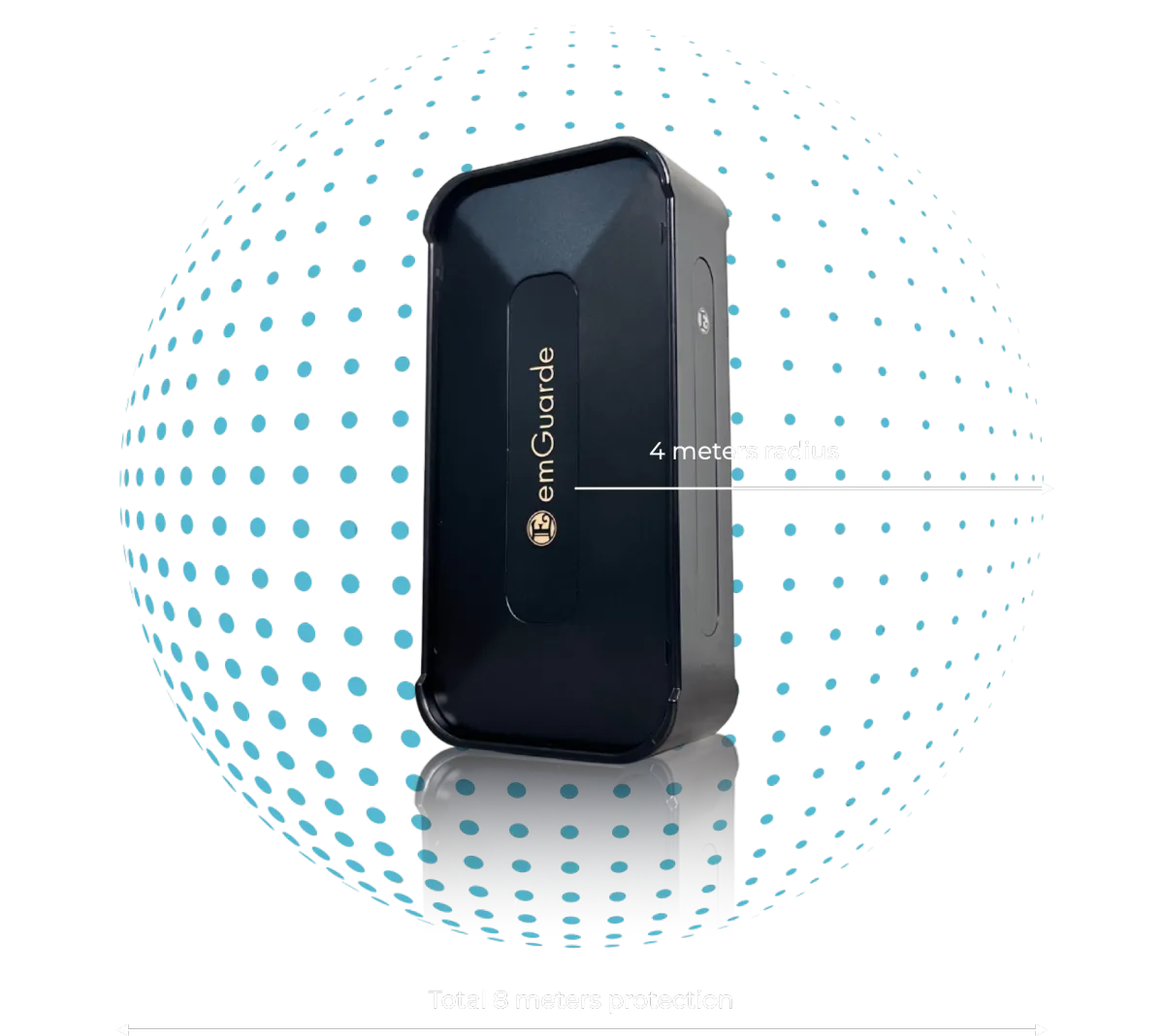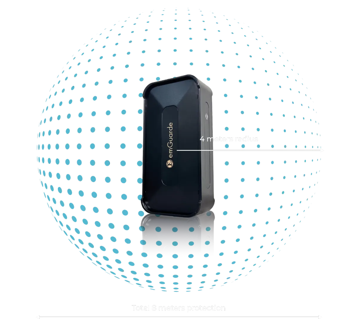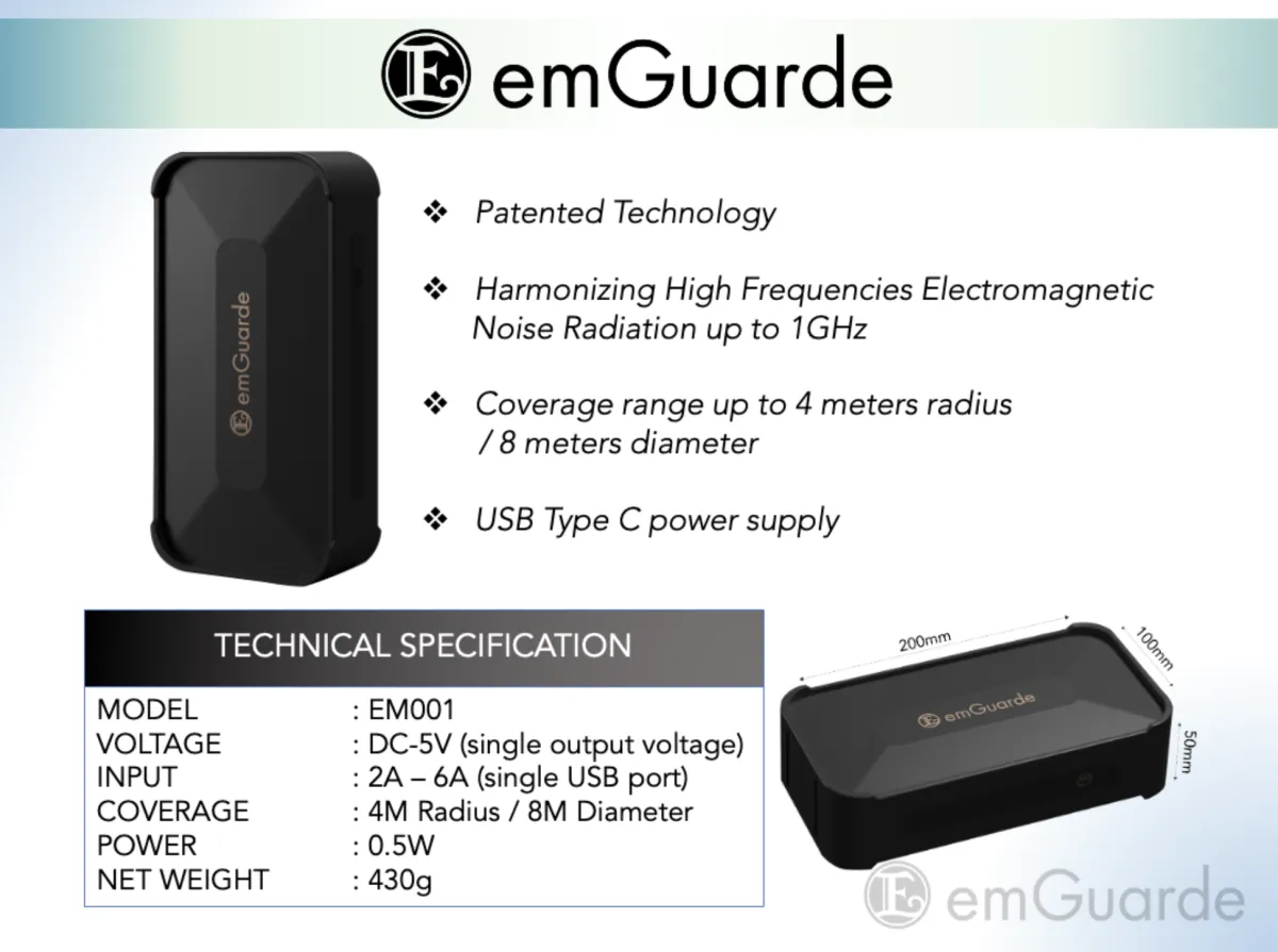• emGuarde’s technology is breaking the pathway of frequencies between 3 MHz to 1000 MHz. Hence, reducing the high frequencies electromagnetic noise within its coverage range. The high frequency electromagnetic noise can be measured in microwatts (unit of power density)